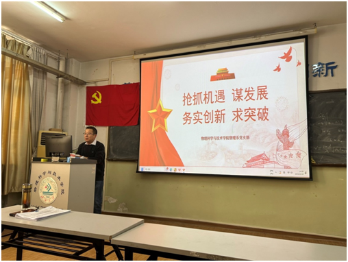 徐锡金院长首先带领大家重温了党的二十大报告的主要内容,总结了学院和物理系前期进行主题教育活动的成果,强调要坚持不懈、持之以恒,以党的二十大精神和习近平新时代中国特色社会主义思想为指南推进学院各项工作。徐院长从宏观层面分析了国家科教事业面临的现状,重点阐述了欧美国家技术封锁长期化带来的影响,以及教育数字化革命给高等教育带来的深刻变革,阐述了未来在教育、科技、人才领域的重点任务;对标国家和社会需求,徐院长强调了作为博士点专业和国家一流专业的物理学专业对学院发展的重要作用,阐述了物理系教职员工肩上承担的重要责任,鼓励大家抓住学院发展的战略机遇,精心谋划物理系发展,求真务实、锐意创新,在重点科研项目、国家和省级教学成果奖等标志性成果上力求实现新突破。