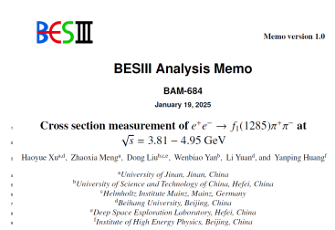 近日,粒子物理团队在BESIII实验数据分析领域取得重要进展,相关研究发表在知名期刊《Physical Review D》上,题为“Cross section measurement of e^+ e^- à f_1(1285) pi^+ pi^- at center-of-mass energies between 3.808 and 4.951 GeV”(https://doi.org/10.1103/567d-cv9k)。粒子物理实验论文需要整个合作组的共同努力,根据国际惯例,粒子物理实验方向发表的论文作者按姓氏字母排序,因此没有传统的第一作者、通讯作者。一篇论文的实际具体工作通常为合作组内多家单位合作研究,本文由买球体育官方网站、中国科学技术大学、德国美因茨亥姆霍兹研究所、北京航空航天大学及中国科学院高能物理研究所合作完成,我院研究生许皓月(现于北京航空航天大学博士在读)为实际第一作者,我院孟召霞副教授为指导教师。