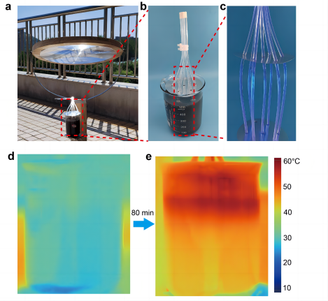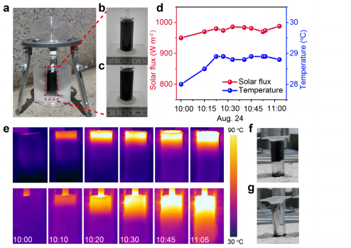 为了进一步验证这种策略在扩大蓄热材料规模时的可行性,搭建了如图4a-c所示简易的户外装置。作者将光导纤维以阵列形式插入500 mL的石蜡中,利用聚光镜将光导入光导纤维。蓄热过程如图4d和4e所示,大概经过80 min,500 mL石蜡全部达到相变温度,证明了这种策略的可拓展性。