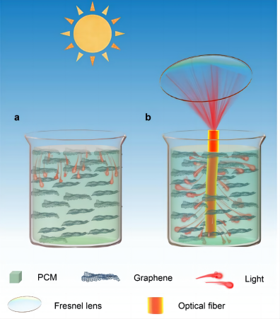 另外,作者指出,这种内通光模式可以和现有的增强蓄热材料热导率的策略结合,从光传输和热传输两个方面共同实现高效的太阳能相变蓄热;光波导纤维也可以选用无机的玻璃纤维,以匹配中高温蓄热过程。