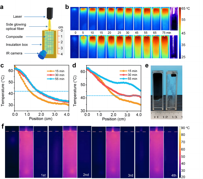 然后将这种光导纤维组装到相变材料内,利用波长450 nm激光进行相比蓄热测试,如图3a。图3b比较了有无光导纤维时相变材料的温度分布随时间变化,并将温度分布提取出来,如图3c 和3d。可以明显的看出,光导纤维存在时,蓄热更快,在30min时有光导纤维的样品基本全部相变(4cm),而直接辐照模式下石蜡只有一般达到相变温度(2cm)。将蓄热55分钟后的装置如图倒置,容器内剩余的石蜡如图3e所示。可以看到,光波导存在时石蜡基本全部融合,而表面辐射模式下石蜡只融化了表面的一部分。图3f为循环稳定性测试,在光导纤维辅助下,相变储能材料可以很好的完成多次蓄热与散热。