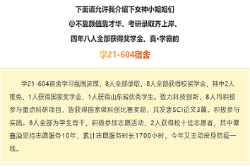 近几年,买球体育官方网站物理科学与技术学院每年都会涌现出“学霸宿舍”,这与学院重视学生自主学习能力培养密不可分。在学院这样的培养氛围里,学21-604宿舍在研究生的道路上取得优异成果,她们在追求卓越的道路上,以榜样的力量助力我院学子考研深造、成长成才,有助于加强我院的学风建设,创建优良学风。“天高任鸟飞,海阔凭鱼跃”,虽然宿舍里的八个人将在不同的大学中继续学习深造,但在本科生活的这段经历将会深深地留在回忆中,希望她们在未来能遇见更优秀的自己!