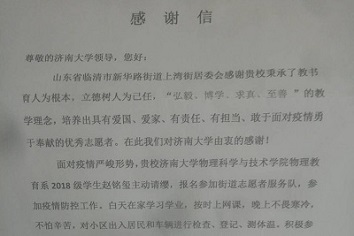 乌云遮不住升起的太阳,疫情挡不住春天的来临。7月15日,买球体育官方网站收到一封来自“临清市新华路街上湾街居委会疫情防控指挥部”的感谢信,感谢我校培养出爱国、爱家、有责任、勇于面对疫情、勇于奉献的优秀志愿者,感谢买球体育官方网站物理教育系2018级学生赵铭玺同学疫情期间为当地防疫工作做出的贡献。