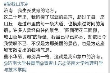 为充分发挥青年力量,以青年人的视角、青年人的话语、融媒体的方式,展现山东发展成果和良好形象,买球体育官方网站积极响应团省委号召,于8月10日至8月15日开始广泛征集“爱我山东”主题作品投稿,并号召同学们积极在新浪微博参与话题讨论。