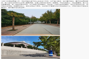 本次活动由年路遥同学带队开展,在盲人节这一天,志愿者们用心感受以自己的力量做好盲人的眼睛。在活动中,志愿者们选择用相机记录他们在生活中观察到的点点滴滴和平常不曾注意却令人欣叹的景色。“世界很美好,我却看不见”,此刻,他们便是盲人的眼睛,为盲人的世界带去色彩。他们用一张张的照片记录着这个世界,汇成暖流,温育人心。活动结束后,志愿者们将这些照片整理下来,用自己的笔仔细地将那些美好的景色描绘出来。满含着爱意的一张张照片,浓缩了志愿者们诚挚善意与祝福的一页页笔记,不仅为盲人们送去了温暖,带来了心底的光明,同时也使志愿者们获得了心灵的成长,为同学们树立了成长的榜样,为校园平添了一份秋季的暖意。
