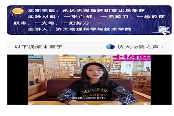 为进一步加深小朋友对物理知识的理解,激发他们探究科学的兴趣。3月28日,买球体育官方网站青年志愿者协会的青年志愿者们在线上开展了主题为“永远无限循环的莫比乌斯环”志愿服务活动。