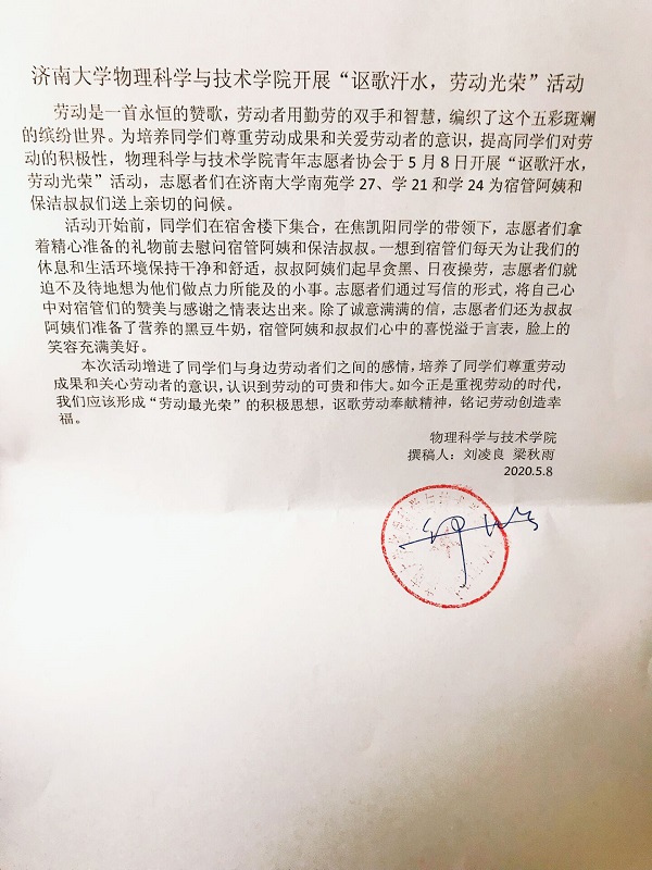 劳动是一首永恒的赞歌,劳动者用勤劳的双手和智慧,编织了这个五彩斑斓的缤纷世界。为培养同学们尊重劳动成果和关爱劳动者的意识,提高同学们对劳动的积极性,买球体育官方网站青年志愿者协会于5月8日开展“讴歌汗水,劳动光荣”活动,志愿者们在买球体育官方网站南苑学27、学21和学24为宿管阿姨和保洁叔叔们送上亲切的问候。