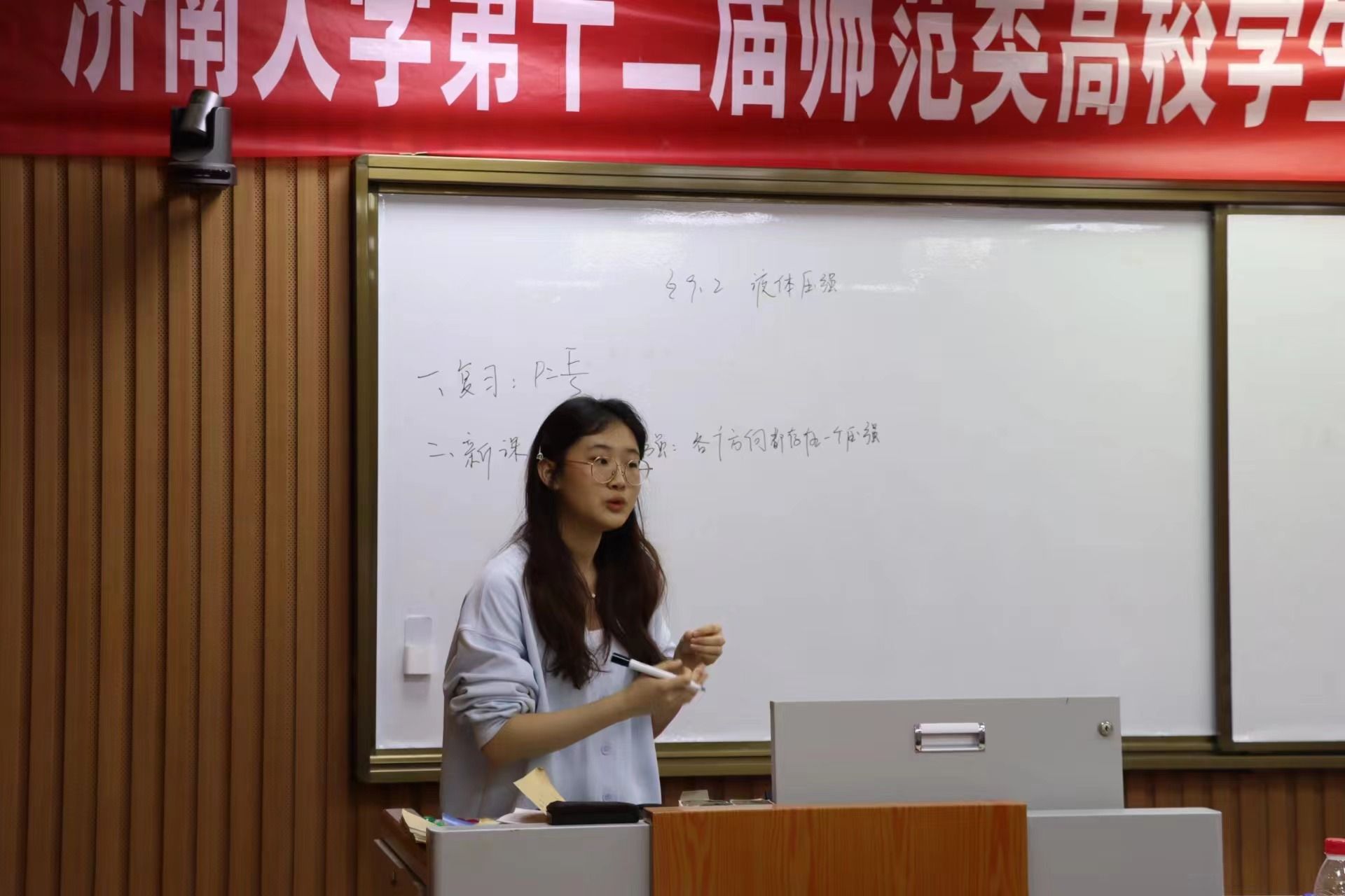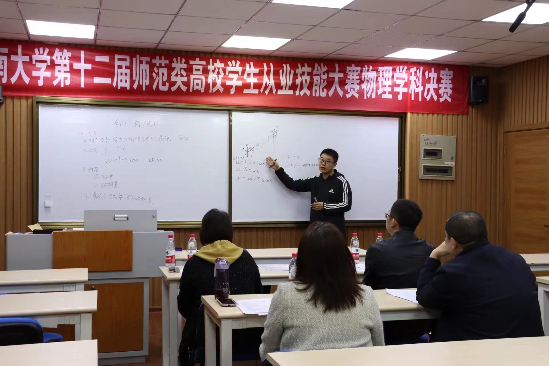 在比赛过程中,选手们随机抽取题目,结合教材进行备课,使用板书进行授课。决赛环节对学生的应变能力、教学基本功的考核要求更为严格。参赛选手借助物理装置图、表格等多种形式,展现了良好的教学风采。在答辩环节,参赛选手思路清晰并沉稳地作答,充分展现了较好的教育理论知识功底和应变能力。比赛结束后,评委老师们就教学仪态与表达、教学方法与手段、教学内容、板书设计、个人特色等方面进行点评和指导,帮助参赛选手分析优势与亮点,找准差距与不足。